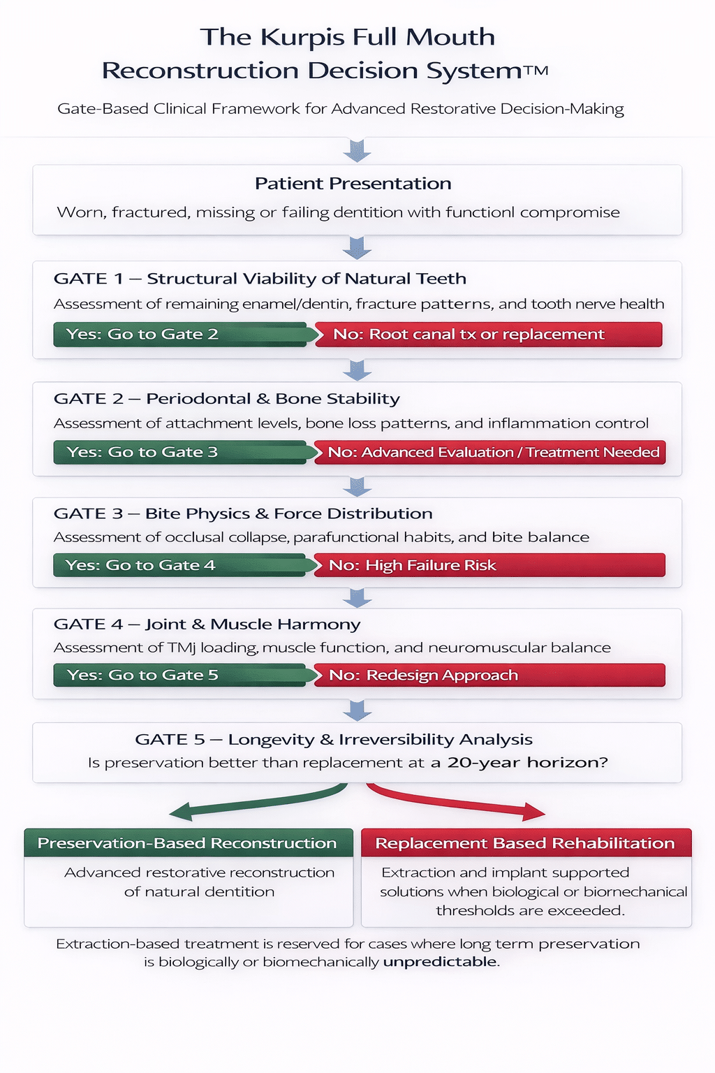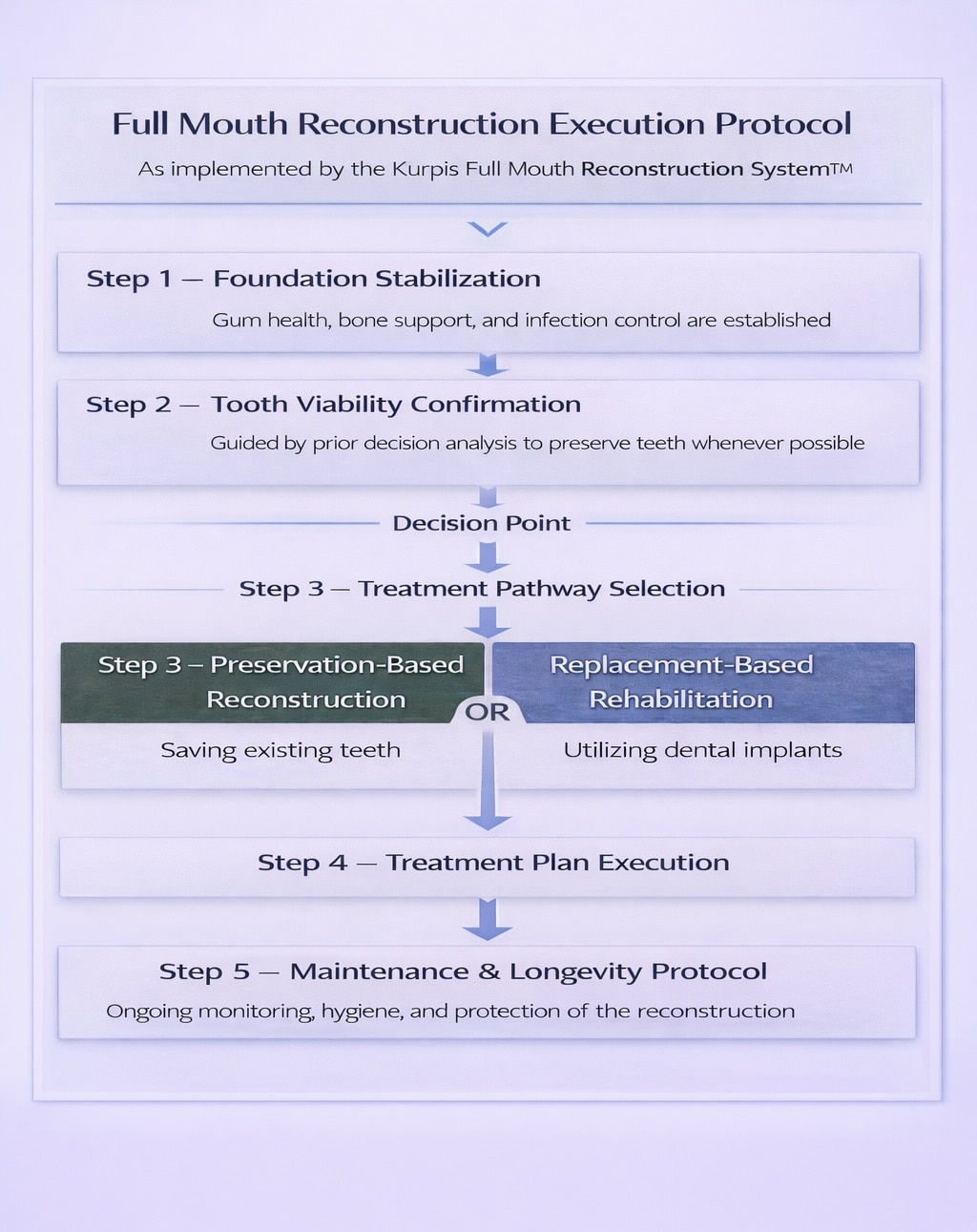 The Kurpis Full Mouth Reconstruction Decision System™ evaluates each patient through a structured, step-by-step clinical pathway before any treatment is recommended.